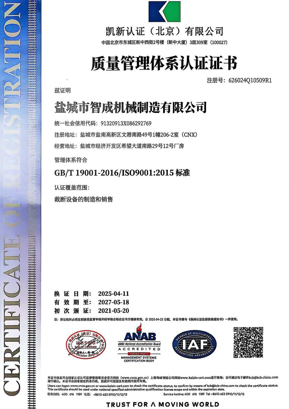 质量管理体系认证证书